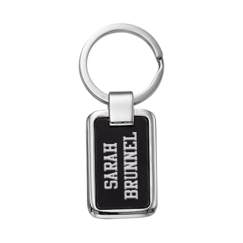 Item description: 1-5/8 x 1 black and silver rectangle key ring. Engraving is available on both sides for maximum of 3 lines of text only on each side.