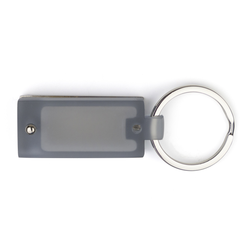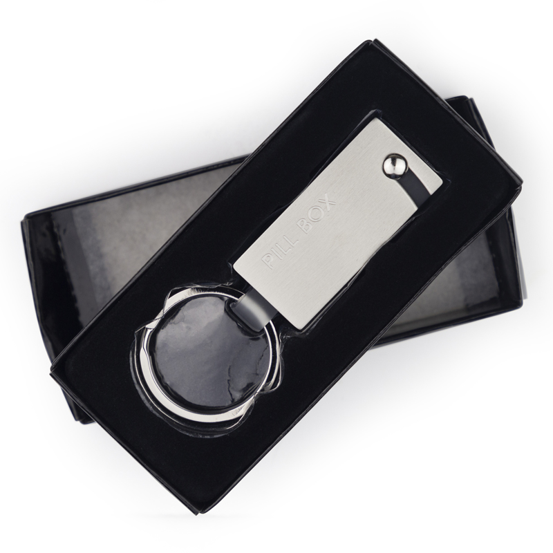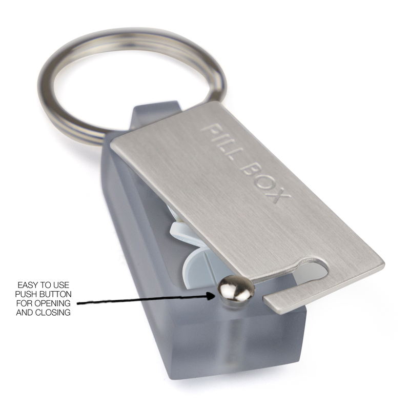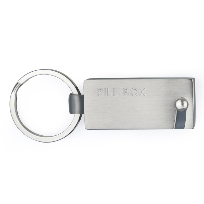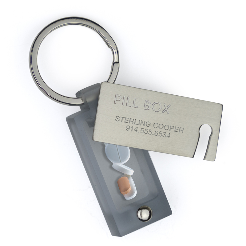Item description: Acrylic and satin silver finish pill box key chain. Size is 1-7/8 (length) x 7/8 (height) inches. Engravable on front of box for a maximum of three lines with 10 characters each.