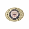 Item description: Gold oval die cast belt buckle with a 2 inch United States Navy insert in the center. Belt buckle measures 2-3/4 (height) x 3-5/8 (width) inches. Features ornate die cast detailing on the border of the buckle. United States Navy insert is made of gold aluminum metal and features litho embossed detailing. It shows an eagle in the center with a shield in the shape of an American flag as part of its body. In the eagle's talons is an anchor around which a rope is tied.