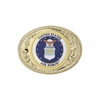 Item description:Gold oval die cast belt buckle with a 2 inch United States Air Force insert in the center. Belt buckle measures 2-3/4 (height) x 3-5/8 (width) inches. Features ornate die cast detailing on the border of the buckle. United States Air Force insert is made of gold aluminum metal and features litho embossed detailing.