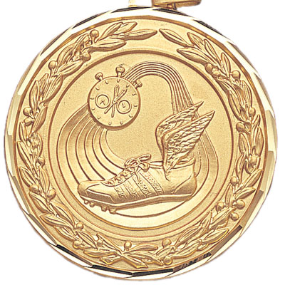 This 2 inch die-struck track themed medals front face is engraved with an image of a winged track shoe atop a running track with a stopwatch above it, and a decorational wreath that surrounds the entire perimeter of the medal. This medals border features a diamond-cut style, and can come in gold, silver, or bronze; the back face can also be custom engraved or imprinted. - IMPRINTING COPY MUST ALL BE THE SAME.