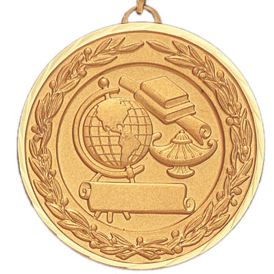 This 2 inch die-struck medal bears the academic achievement design on its front and is bordered with a method of scalloping identical to diamond cut engravings. The design depicts a globe, some books, and a lamp. This medal is available in gold, silver, or bronze, and it can be engraved or imprinted on the back. - IMPRINTING COPY MUST ALL BE THE SAME