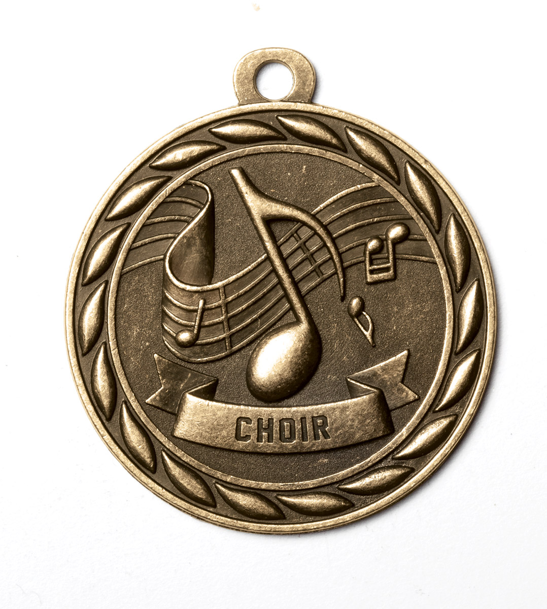 Various musical notes floating around a banner titled: 'Choir' have been engraved onto the front of this brass-only medal. The medal can be custom engraved or imprinted on it's back face, and it comes with a classic antique finish.