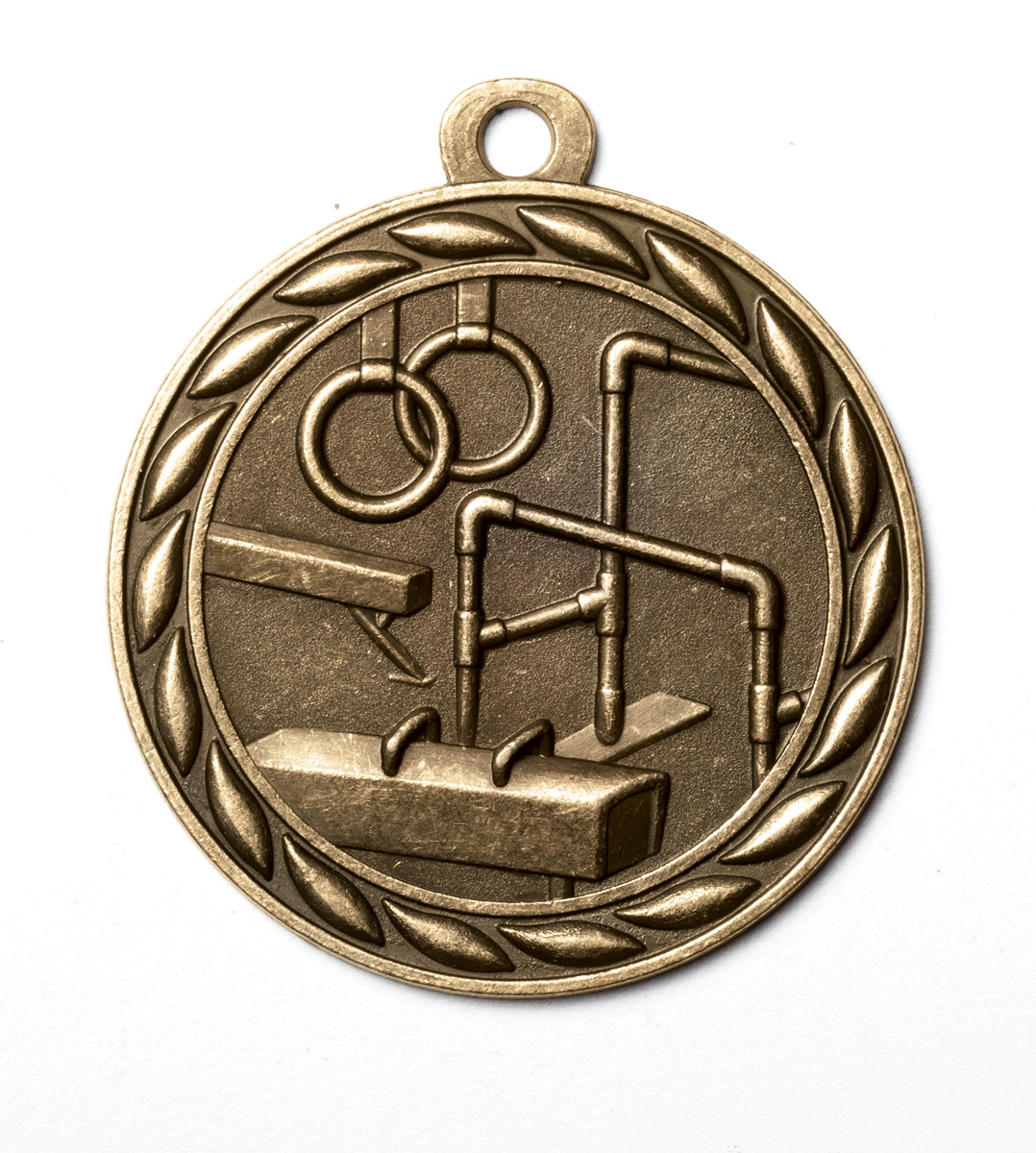 Various pieces of gymnastics equipment within a sleek wreath border have been engraved onto the front of this 2 inch in diameter brass-only medal. The medal has a blank back face for custom engraving or imprinting, and comes with a neat antique finish.