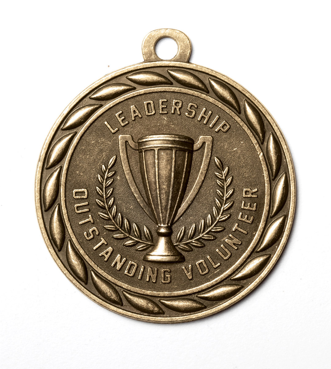 This variant of 2 inch in diameter antique-brass medal is engraved on its front with an image of a large trophy surrounded by a laurel wreath and radial text that reads: 'Leadership - Outstanding Volunteer'. The back of the medal can be custom engraved or imprinted, however, it is available in only brass with an antique finish.