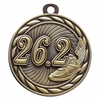 This variant of 2 inch in diameter runners medal has a front face engraving of a large '26.2' accompanied by a winged track shoe, all within a sleek and neat wreathed border. This die-cast medal comes available in only gold with an antique finish, and the back face is left blank for custom engraving or imprinting.
