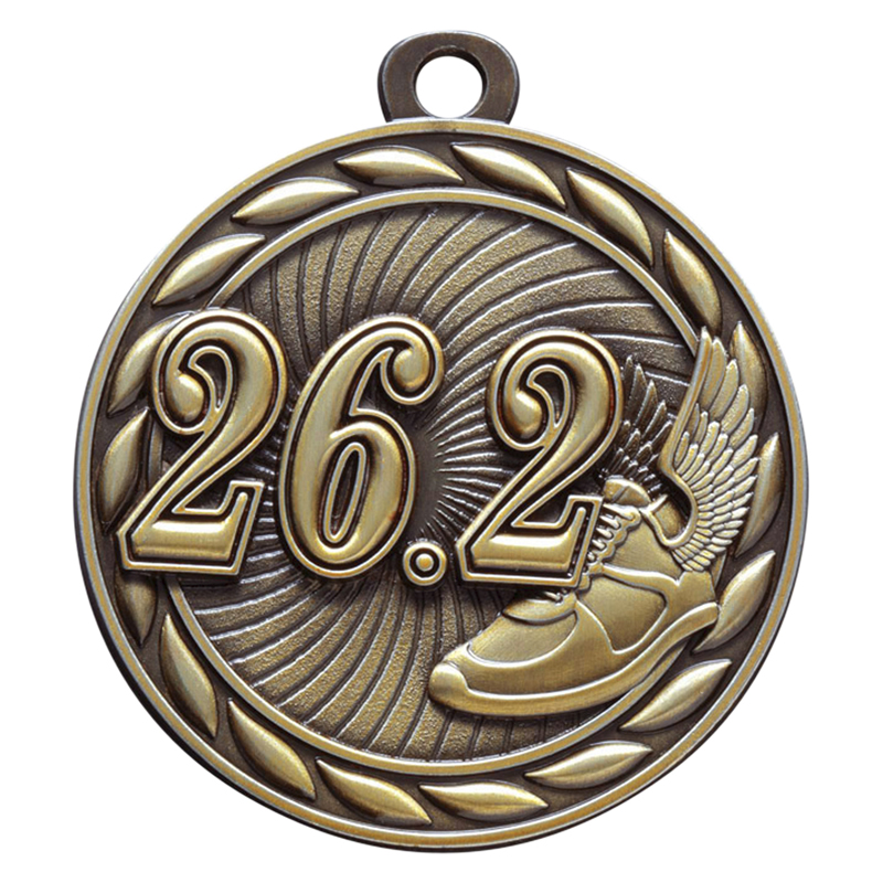 Die-Cast Metal 2-Inch in Diameter Round 26.2 Run Medal with Cutomizable Back in Antique Gold