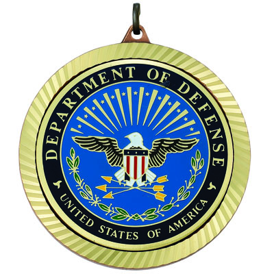 Item Description: 2 3/8 inch die struck brass medal frame holds 2 inch U.S. Department Of Defense etched enameled medallion or an insert of your choice.