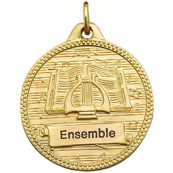 This 1-1/4 inch variant of music medal is decorated on its front with a lyre over a book of sheet music above a customizable scroll, and a sheet music backdrop. The available imprints include text reading: Band, Choir, Chorus, Ensemble, Honor, Jazz Band, Music, Orchestra, or Solo. This medal is only available in gold, but the back face can be fully customizable, unlike the front which is limited to only the stock imprints. - IMPRINTING COPY MUST ALL BE THE SAME.