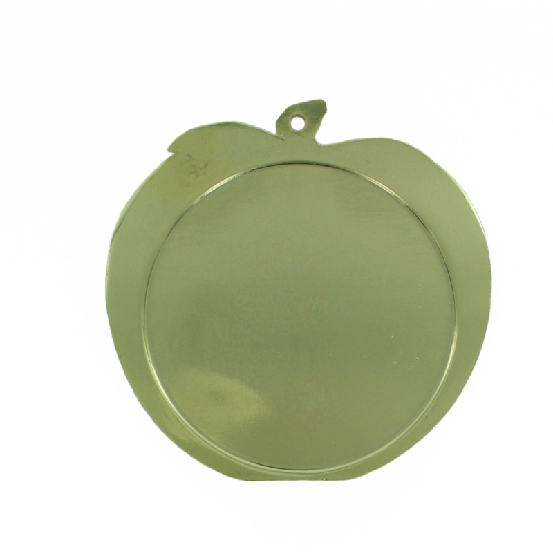 Item Description: 2-1/2 inch apple shaped gold medal frame holds 2 inch insert.