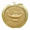 This apple medal variant has a detailed 2 inch insert that illustrates a lamp in front of an open book and a section of wreath. The medal has a loop for attaching ribbons or chains, and it is available in gold, silver, or bronze.