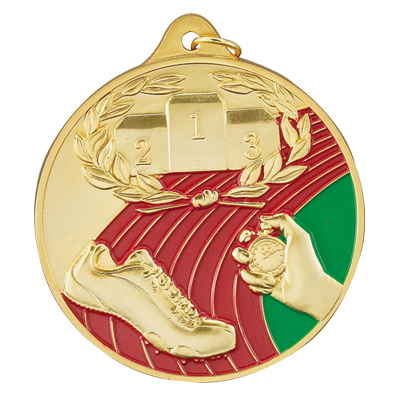 The engraving depicted on the frontside of this 2-1/2 inch enameled die-cast medal illustrates a track shoe, a podium, and a handheld stopwatch with a track field in the background. The back of the medal has ample space for custom engraving or imprinting, and the medal comes available in gold, silver, and bronze; the bronze option has an antique finish as opposed to the rich matte finish of the other two options.