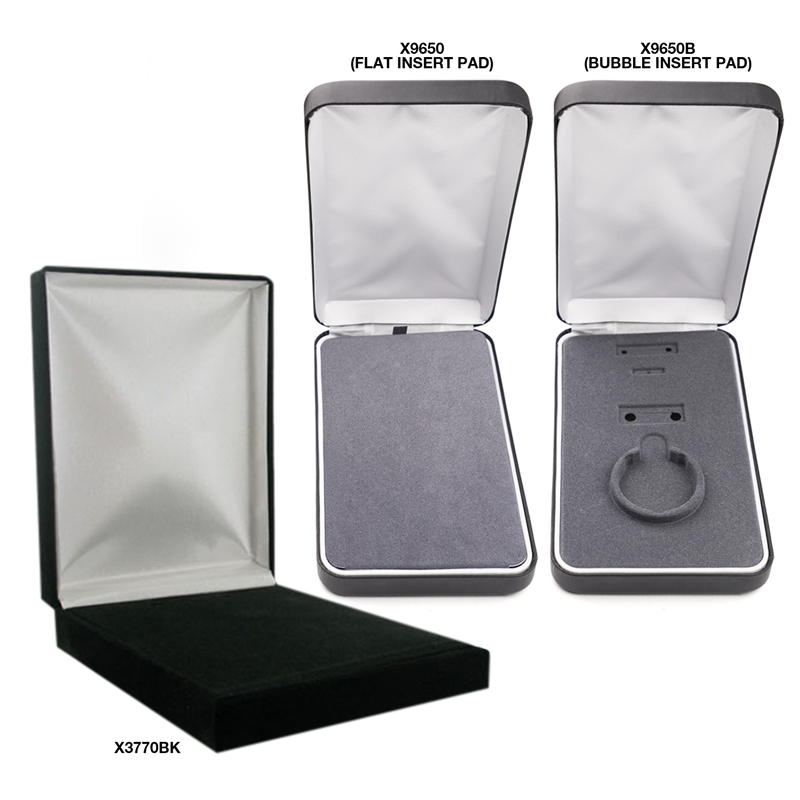 2) 4-1/4" x 7" x 1" Black leatherette deluxe hinged box with grey bubble velour insert - X9650B