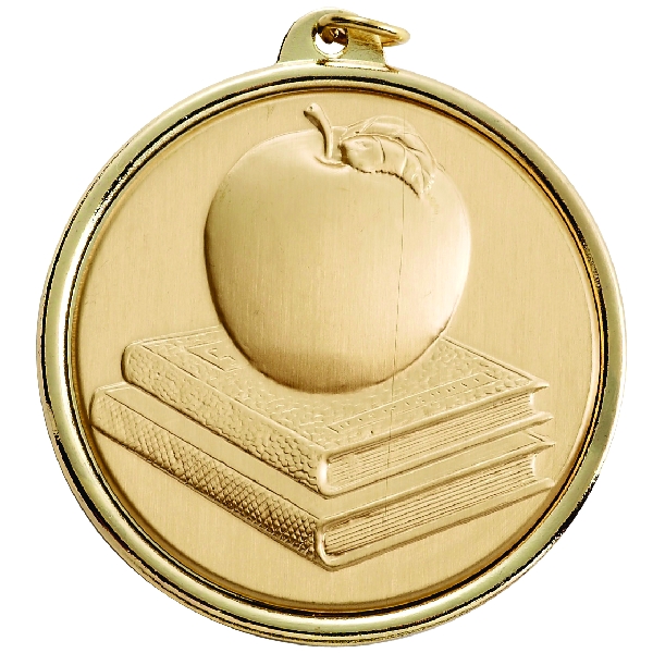 On the front of this 2-1/4 inch gold medal is a 2 inch stamped medallion insert with an engraving of an apple atop a set of books on it. The medal comes with a loop at the top, space on its back for custom engraving or imprinting, and is available in gold, silver, or bronze. - IMPRINTING COPY MUST ALL BE THE SAME.