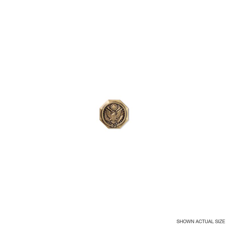 Item Description: Official Federal Government 45 Years of Service lapel pin featuring 3D modeled eagle design representing the seal of the United States. Octagon shaped pin is approved by the United States Army of Heraldry; their hubs and dies were used to make our dies. Licensed by the Heraldry and made in the United States of America. Gold finish representing 45 years of service. The pin measures 5/8 (height) x 5/8 (width) inches and has a thickness of 2 mm - backing is a non-rotating nail with a quality spring loaded clutch.