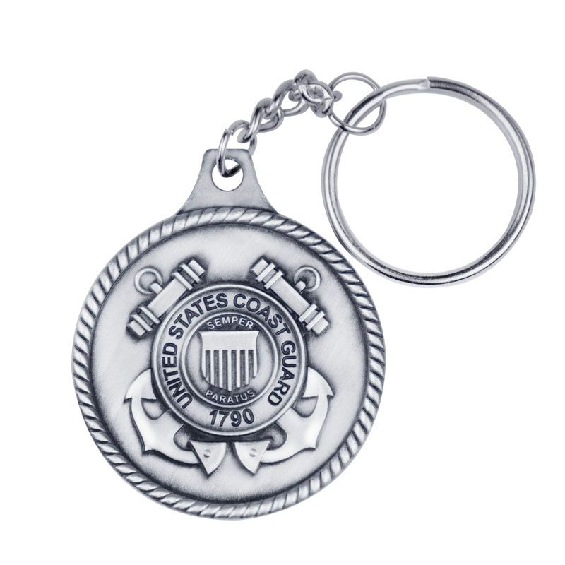 Item description: Sculptured Genuine U.S. Coast Guard Pewter key chain. Measures 1-7/8 x 1-5/8 Inch, full length is 4-1/4 inches.
