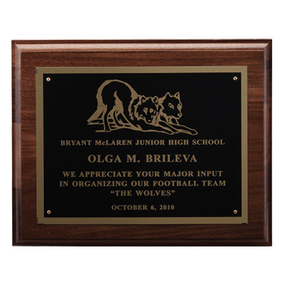 Out of Stock.Item Description: 8 x 10 inch genuine walnut plaque comes with 6 X 8 inch laser able black screened brass plate with gold border.