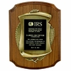 Item Description: 9 x 12 inch genuine walnut plaque comes with a brass cast scroll frame and 3-3/4 X 5-3/8 inch laser able color marbleized plate.