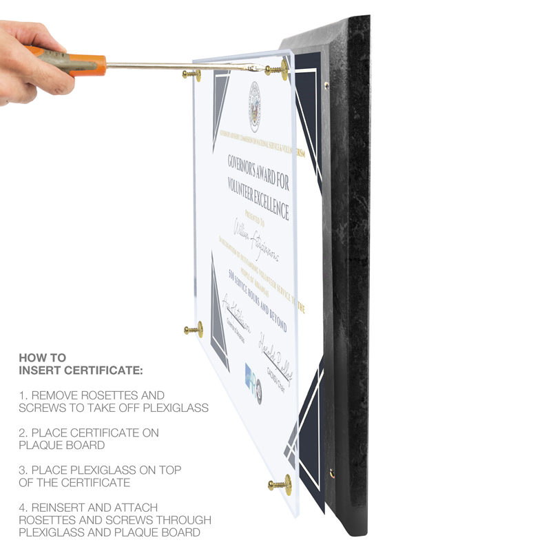 Item Description: 10-1/2 inch x 13 inch black marble finish plaque holds 8-1/2 inch x 11 inch certificate and attached with screws.