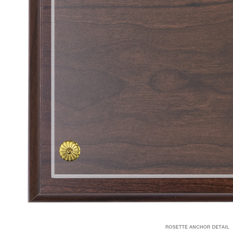 Item Description: 10-1/2 inch x 13 inch walnut finish plaque holds 8-1/2 inch x 11 inch certificate and attached with screws.