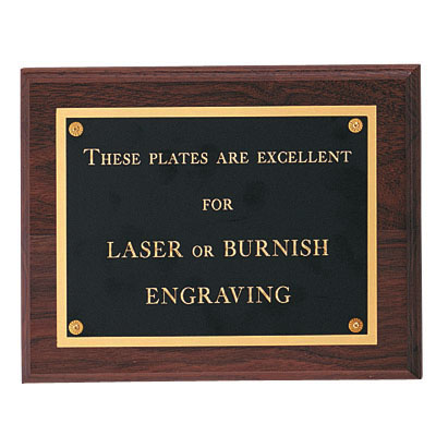 Item Description: 7 x 9 inch walnut finish plaque comes with 5 X 7 inch laser able black screened brass plate and 4 rosettes.
