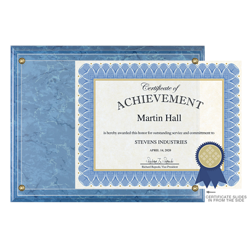 Product Description 10-1/2 inch x 13 inch blue marbleized plaque holds 8 1/2 inch x 11 inch certificate on molded plexiglass frame which slides certificate in from side.