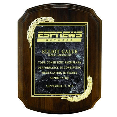 Item Description: 9 x 12 inch genuine walnut plaque comes with 6 x 8 inch laser able marbleized screened brass plate with gold border, and two gold wreath castings.