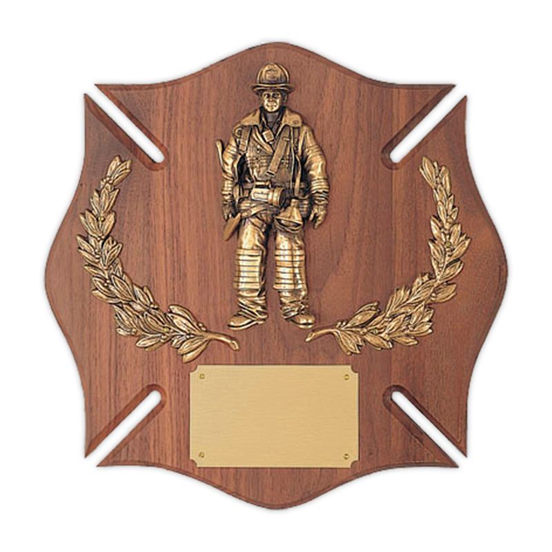 Item Description: 14 x 14 inch genuine walnut plaque comes with 5 x 3 inch gold plate, two metal wreaths and 7-1/2 inch antique gold hand painted fireman plaque mount.
