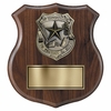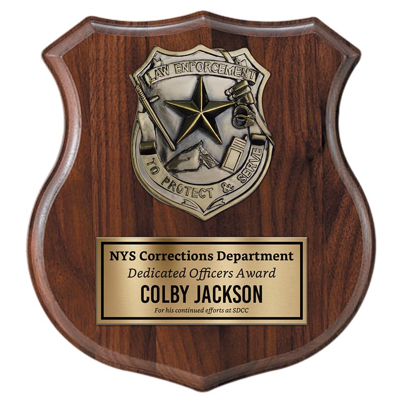 Item Description: 8-1/4" x 9" genuine walnut shield plaque comes with bronze high relief law enforcement shield medallion and 5 x 2-3/4 inch screened brass plate with black border.
