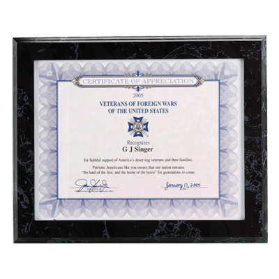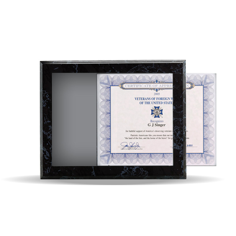 Item Description: 10-1/2 inch x 13 inch black simulated plaque holds 8-1/2 inch x 11 inch certificate that slides in from the side. Certificate not supplied.