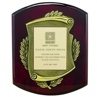 Item Description: 10-1/2 x 13 inch piano finish rosewood color plaque comes with a die stamped scroll frame and 4-1/2 X 6 inch laser able color marbleized plate.