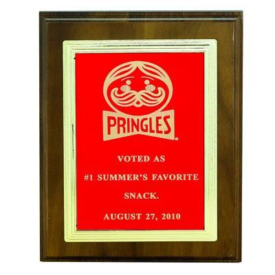 Item Description: 8 x 10 inch walnut finish plaque comes with 5 X 7 inch laser able color screened plate inside an embossed plastic frame.