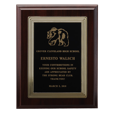 Item Description: 7 x 9 inch walnut finish plaque comes with 4 X 6 inch laser able color screened plate with gold embossed borders.