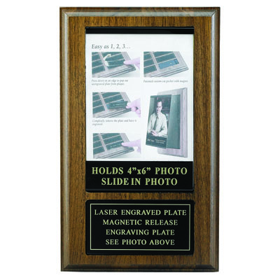Item Description: 6 x 10 inch walnut veneer photo plaque holds a 4 X 6 inch photo, slides in from the side and has magnetic release frame and plate.