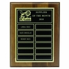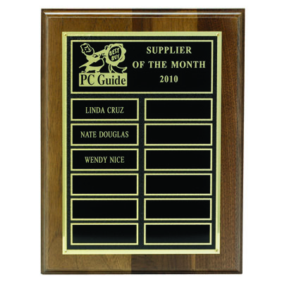 Item Description: 9 x 12 inch perpetual walnut finish plaque comes with a 7 x 10 inch single black screened plate for laser engraving. Full plate contains space for header text and 12 spaces for names.