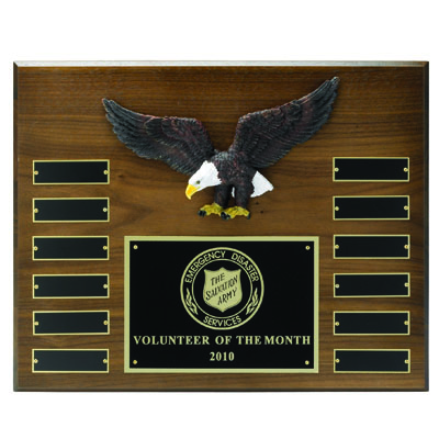 Item Description: 8 x 10 inch walnut finish plaque comes with 6 x 8 inch frosted borders color plate.Item Description: 12 x 15 inch walnut finish multiple plate plaque with 12 black screened 2-3/4 x 7/8 inch name plates for laser engraving, and hand painted resin eagle.