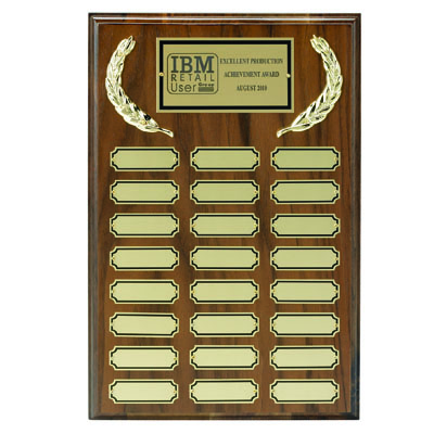 Item Description: 8 x 10 inch walnut finish plaque comes with 6 x 8 inch frosted borders color plate.Item Description: 10 x 15 inches Genuine walnut multiple plate plaque, with 24 2-1/2 x 7/8 inch satin gold silk screened border plates and 2 gold cast metal wreaths.