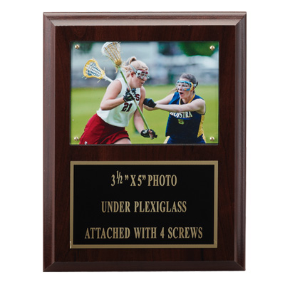 Item Description: 7 x 9 inch walnut finish photo plaque holds a 5 X 3-1/2 inch photo and comes with a 3 x 5 inch laser able black screened plate.