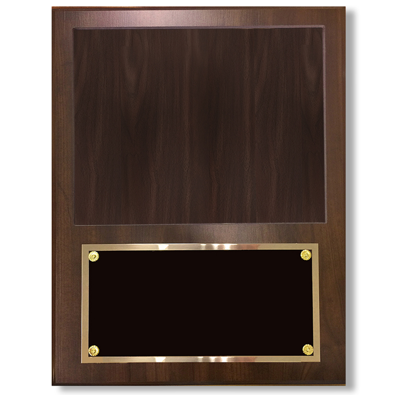 Item Description: 12 x 15 inch walnut finish photo plaque holds a 8 X 10 inch photo and comes with a 5 x 7 inch laser able black screened plate.