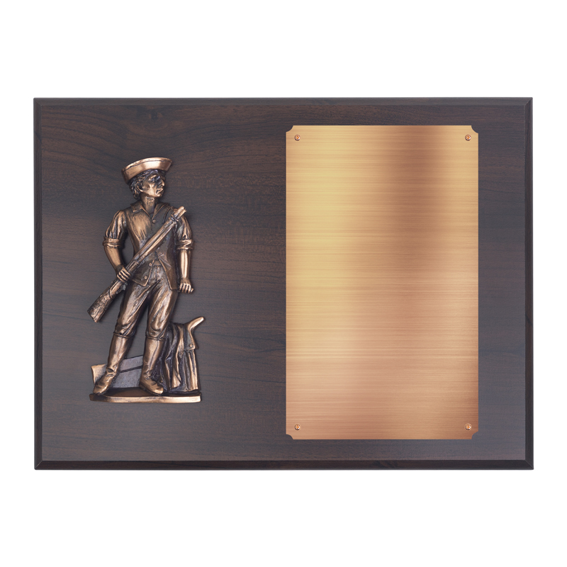 Item Description: 9 x 12 inch simulated walnut finish plaque with a 6 inch copper electroplated bronze Minuteman casting and a 7-1/2 (height) x 4-1/2 (width) inch bronze engraving plate. Bronze Minuteman casting is incredibly detailed and is three dimensional. Plaque has a key hole on back for easy hanging. Can be engraved with up to 10 lines of text, maximum 35 characters per line.