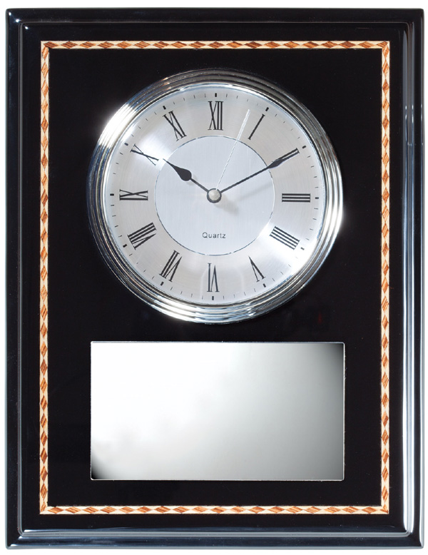 Item Description: 13 x 10 inch black piano finish clock plaque with silver plate. It could be wall mounted or self standing.