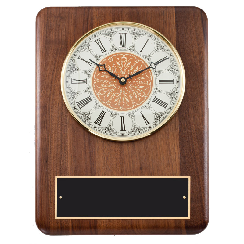 Item Description: 11 x 15 inch genuine walnut plaque has antique quartz movement clock and black and gold engraving plate to be laser engraved. Comes gift boxed.