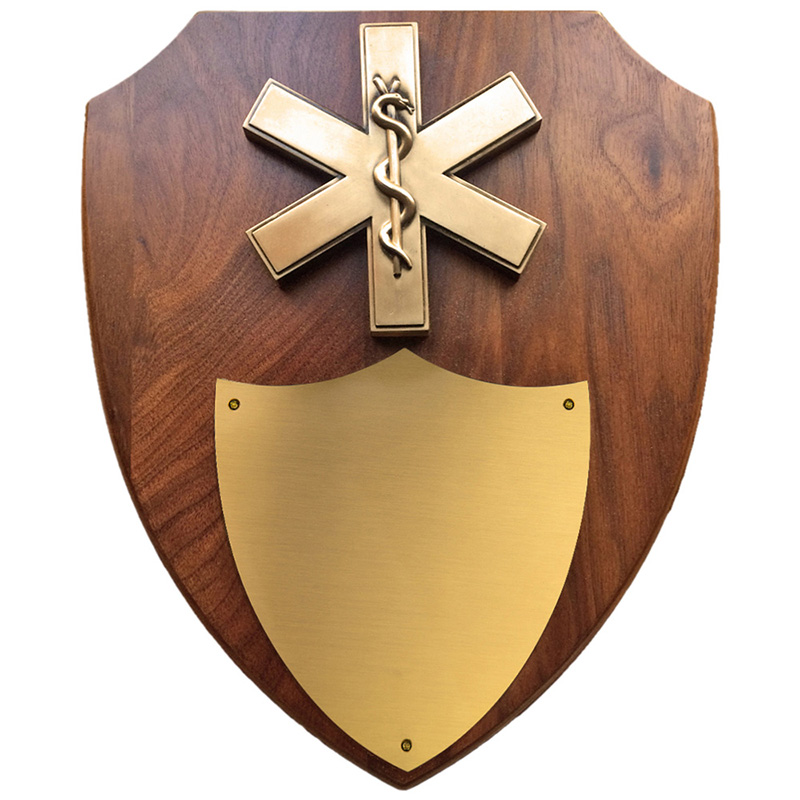 Item Description: 10 x 12 inch EMT star of life walnut veneer plaque with brass metal shield shape plate. The brass shield metal plate can be mechanically engraved with a diamond drag cutter.