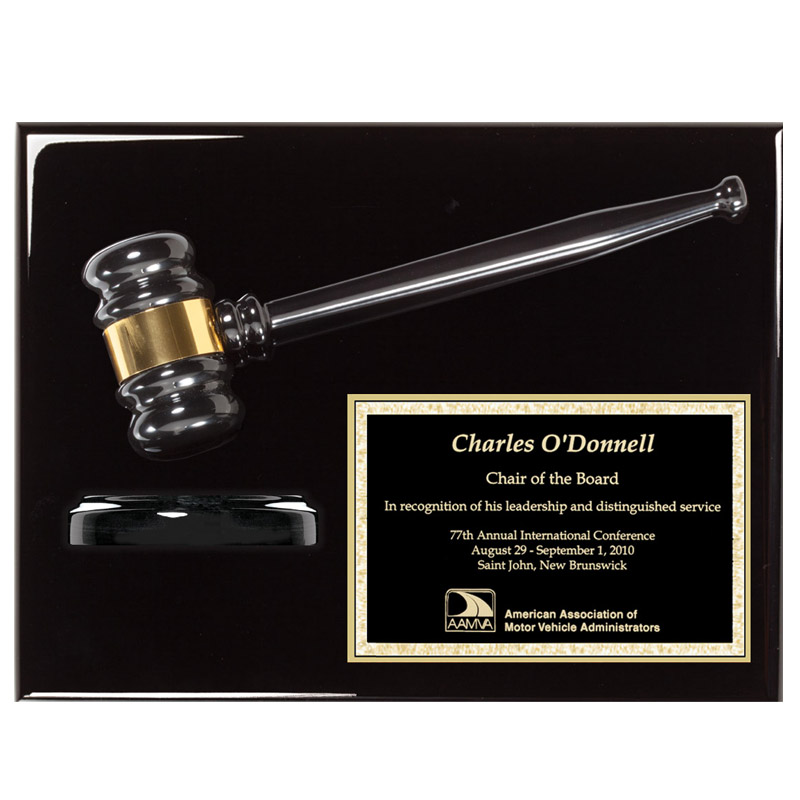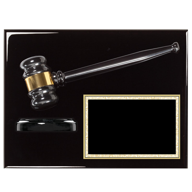 Item Description: Ebony piano finished gavel and gavel block plaque. Comes with matte black engraving plate. Plaque size 9 x 12 inch.
