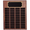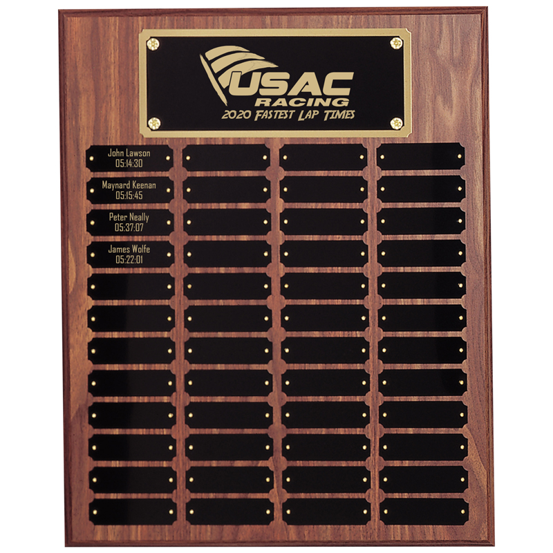 Item Description: 16 x 20 inch walnut finish perpetual plaque with 48 name plates. Includes black and gold header plate and 48 black notched corner name plates, which engrave with a gold finish. Comes individually boxed.
