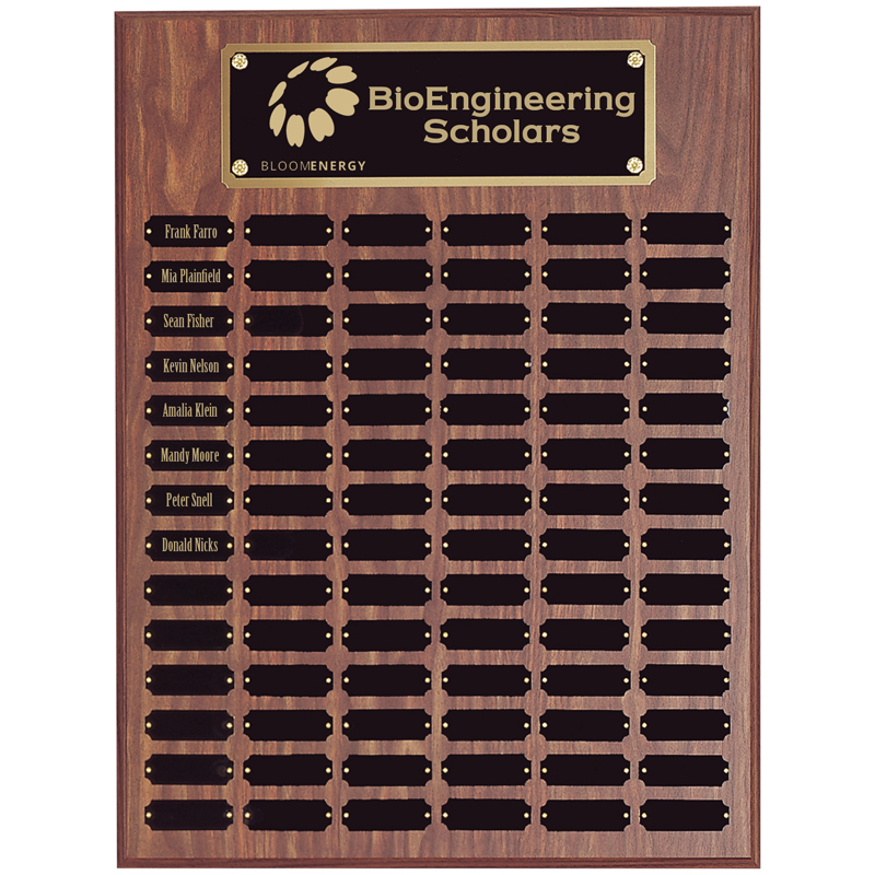 Item Description: 18 x 24 inch walnut finish perpetual plaque with 84 name plates. Includes black and gold header plate and 84 black notched corner name plates, which engrave with a gold finish. Comes individually boxed.
