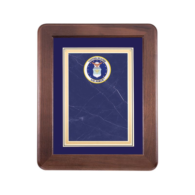 Item Description: 9-1/2 x 11-1/2 inch Genuine walnut shadowbox plaque with blue velour border and 2 inch embossed U.S. Air Force medallion insert. Comes with blue marble and gold edge engraving plate.