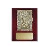 7 x 9 Inch piano finish Rosewood plaque with Fire Fighter themed Electroplated brass plaque mount. The Plaque mount illustrates a firefighter running into brick building with flames all around and the words "The Bravest" at the bottom. The plaque includes a matte gold plate that measure 6 x 2 inches.