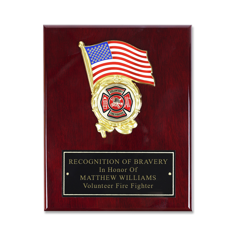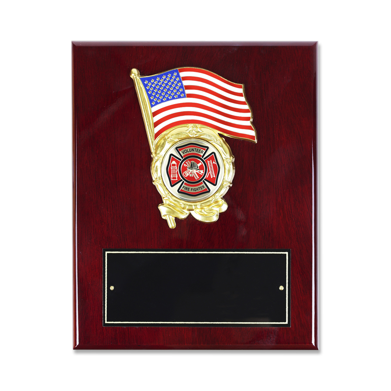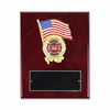 8 x 10 Inch piano finish Rosewood plaque with American Flag featuring a 2 inch Fire Department medallion insert. The plaque includes a black screened plate that measure 6 x 2-1/2 inches which engraves gold.