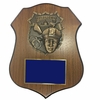 Item Description: 9 x 11-1/2 inch walnut veneer Police shield shape plaque with high relief casting antique brass police shield. Comes with blue and gold engraving plate.